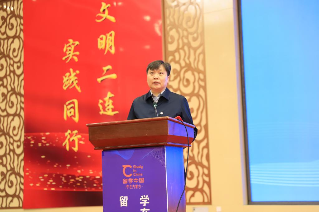我校作为自治区高等教育学会外国留学生教育管理分会理事长单位与二连浩特市教育科技局共同承办此次活动,副校长达胡白乙拉出席会议并致辞。
